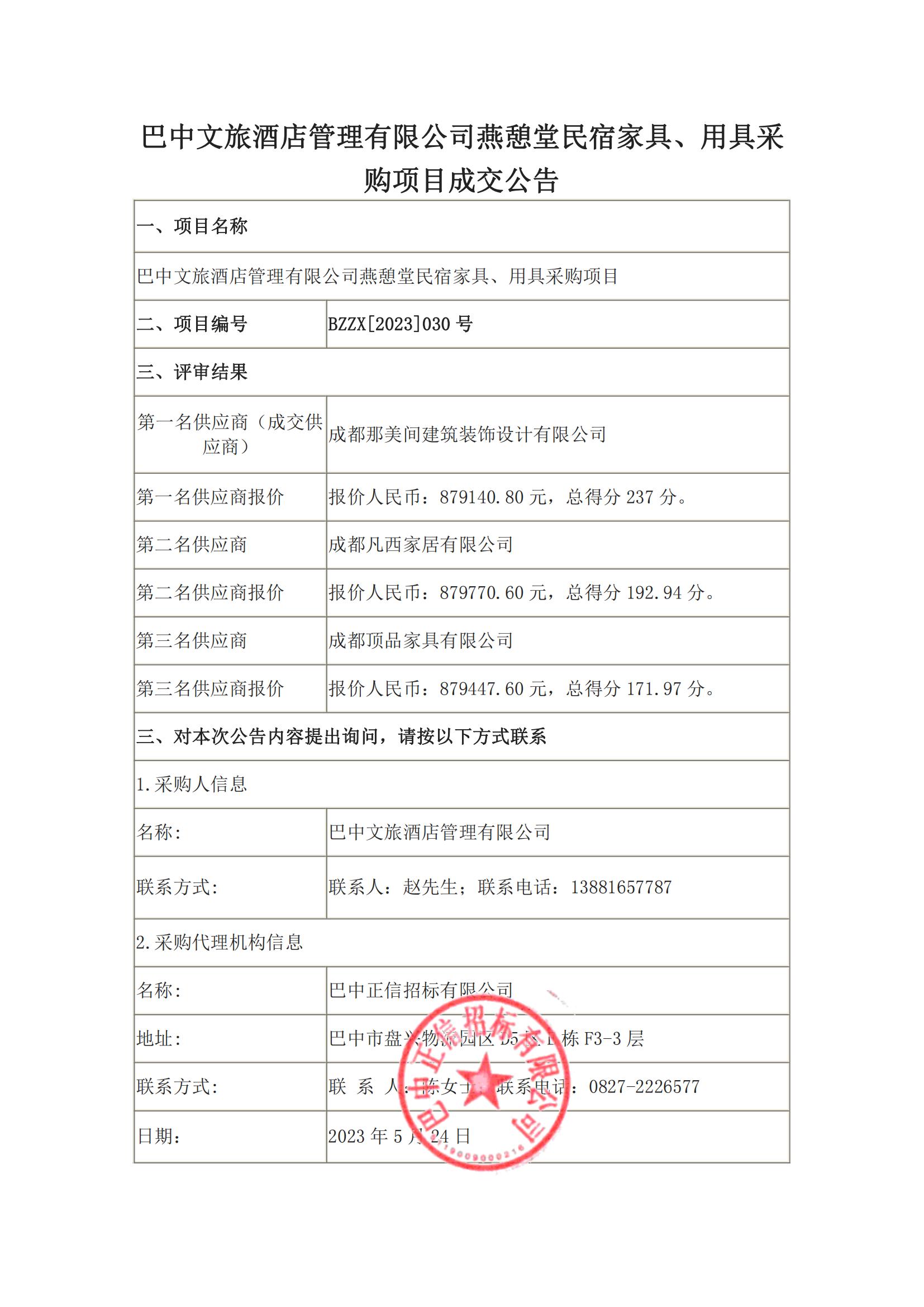 巴中文旅酒店管理有限公司燕憩堂民宿家具、用具采購項目成交公告